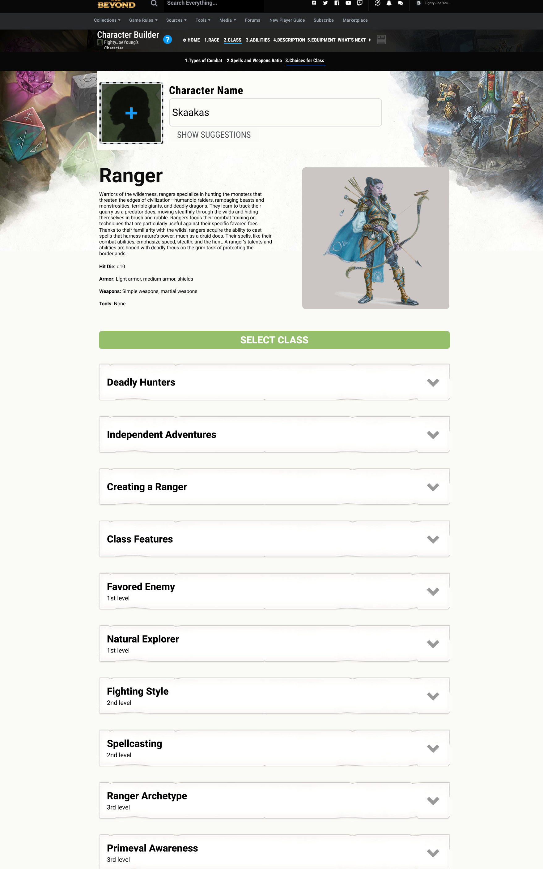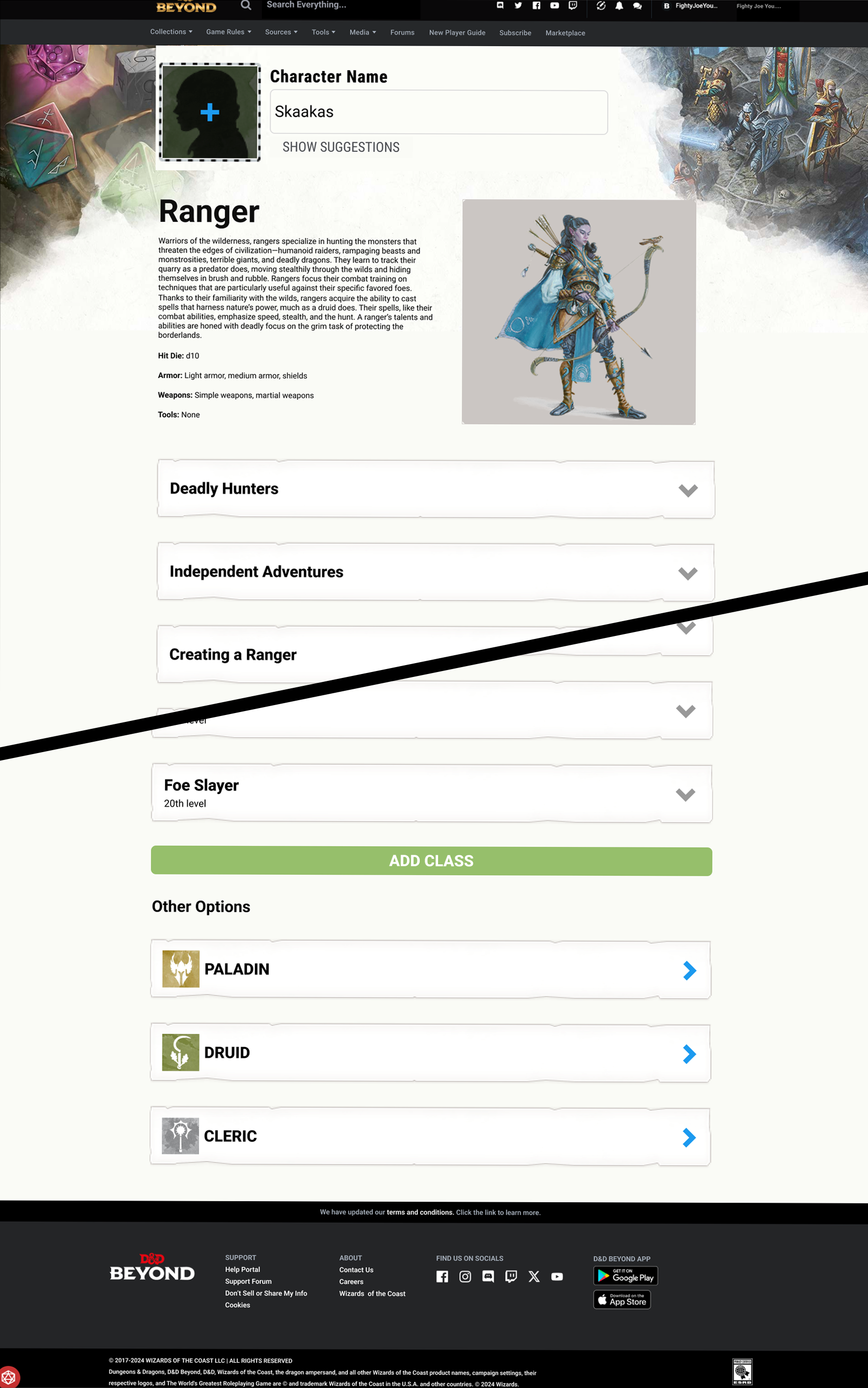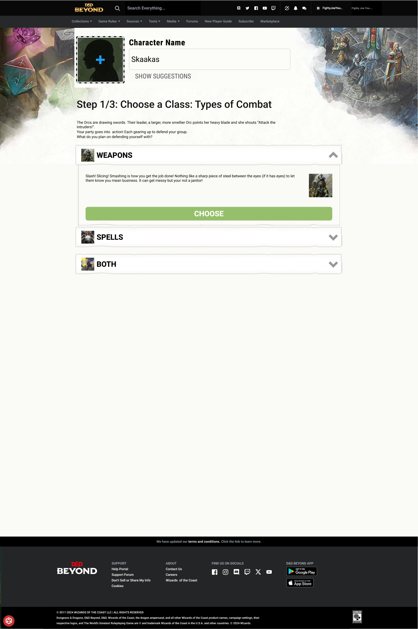 When you finally decide on Skaakas’s class …Ranger, the button is at the bottom of the page, a rather long page.