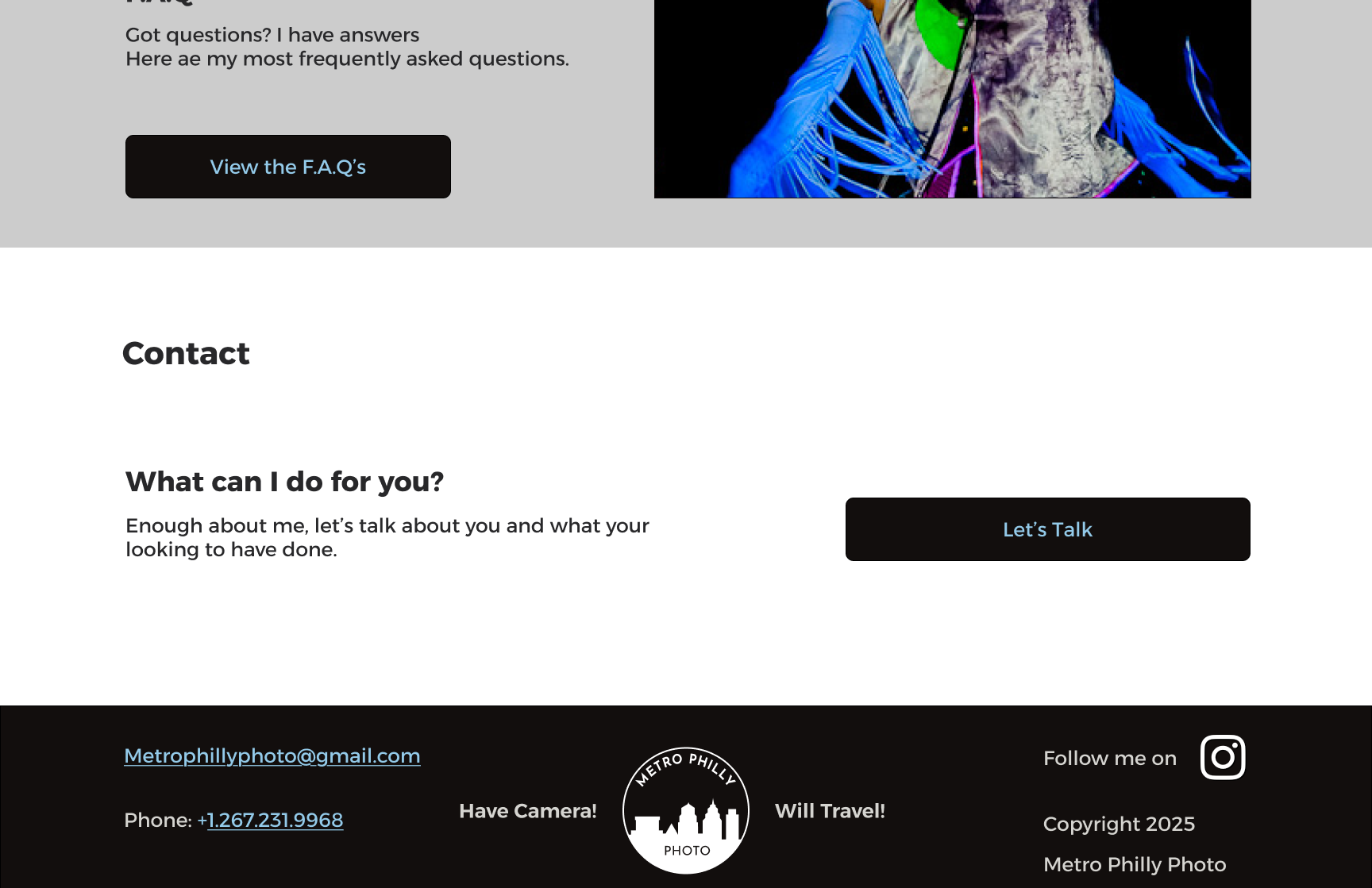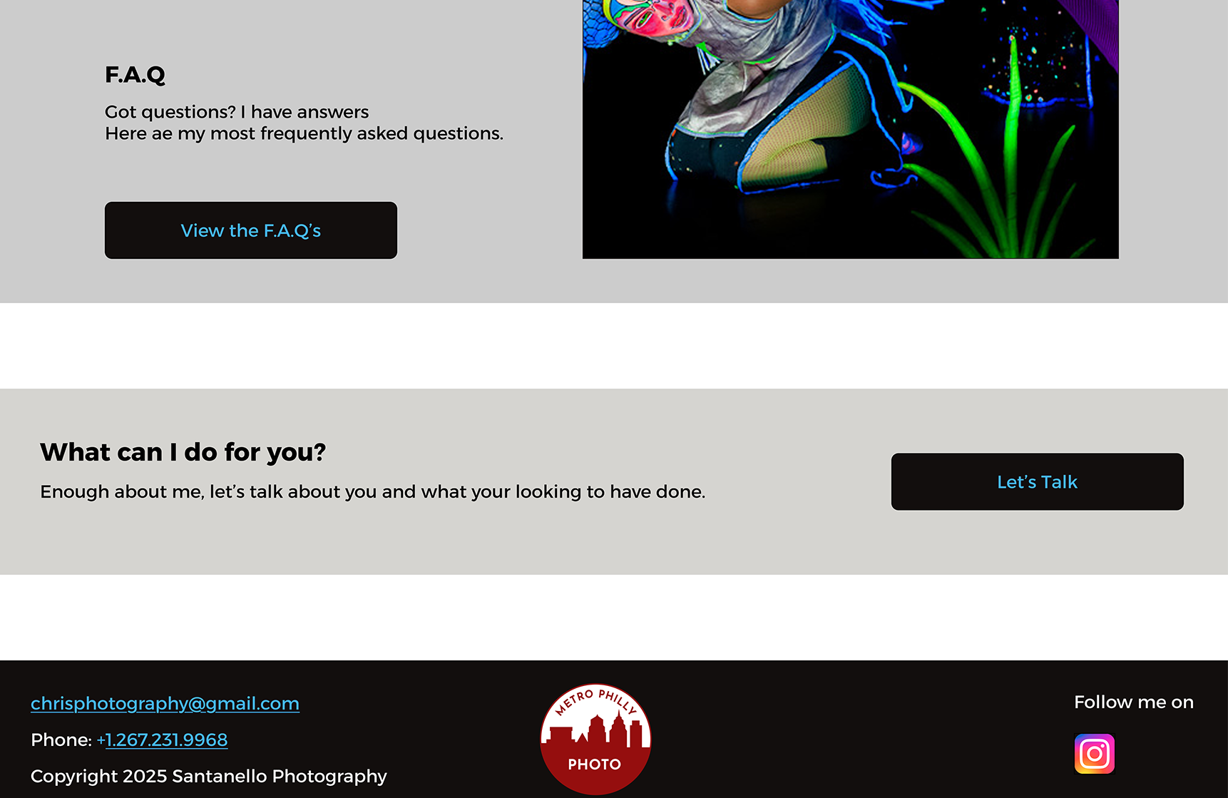 Chris needs a contemporary site that shows his variety of work, excite a potential customer and relay the message to contact Chris to discuss the potential photo shoot in mind.